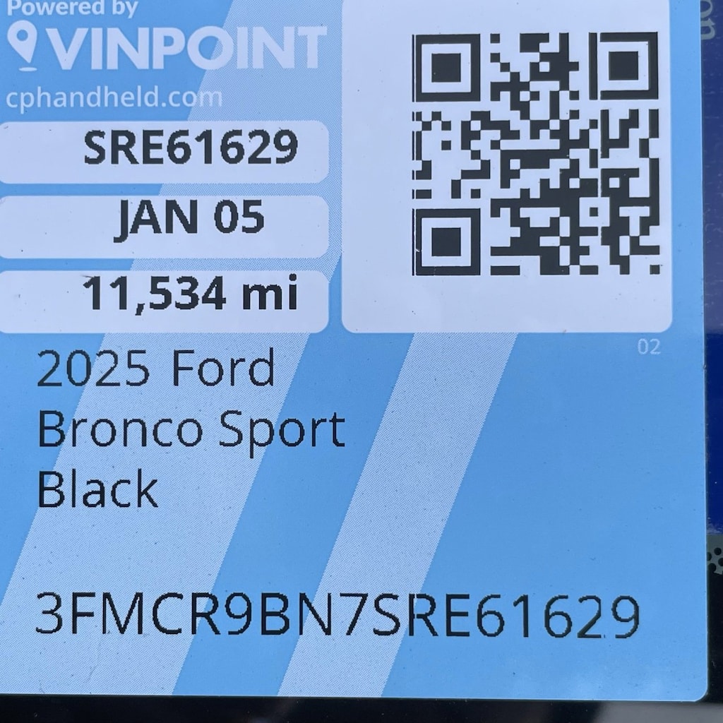 Bronco Sport Big Bend, 4D Sport Utility, 1.5L EcoBoost, 8-Speed Automatic, 4WD, Shadow Black, Medium Lt Smoked Truffle Cloth, Equipment Group 200A.Recent Arrival! Odometer is 1576 miles below market average!CARFAX One-Owner.Shadow Black 2025 Ford Bronco Sport Big Bend 4D Sport Utility 4WD 8-Speed Automatic 1.5L EcoBoost
